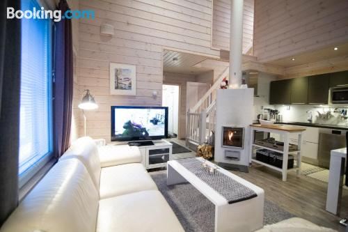 这家空调乡村民宿配有2间卧室、起居室、带冰箱和咖啡机的设施齐全的厨房以及1间带淋浴设施和吹风机的浴室。这家乡村民宿也配有休息区和1间浴室。